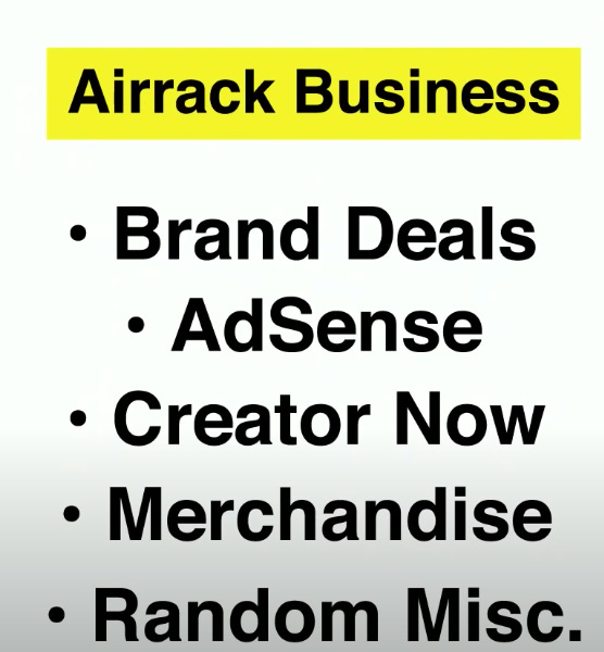 What’s different for Airrack than other creators is that he makes about 25% of his income from Ad Sense. That is different from most creators who make about 90% of their income from brand deals. This means two things 1) Airrack is pushed by YouTube into many sub boxes and he is making good money from it and 2) He doesn’t have to rely on pushing any brands, he has more creative control because he can live on ad sense money.