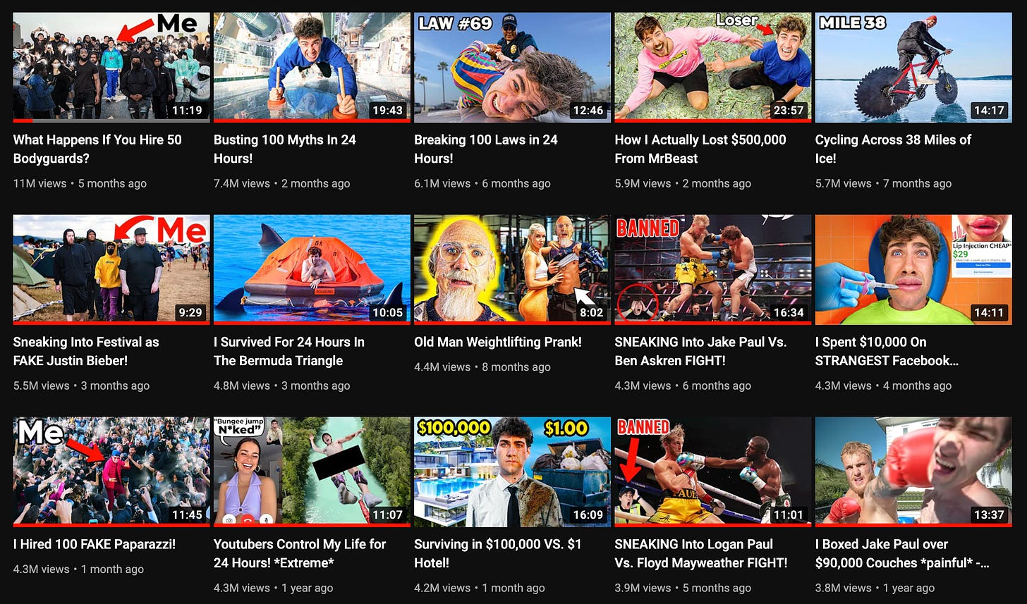 His content style is definitely on the borderline crazy mixed with an insane work ethic and the “do what it takes” mindset. Just a quick look at thumbnails, you can get what the video is about just from the thumbnail.