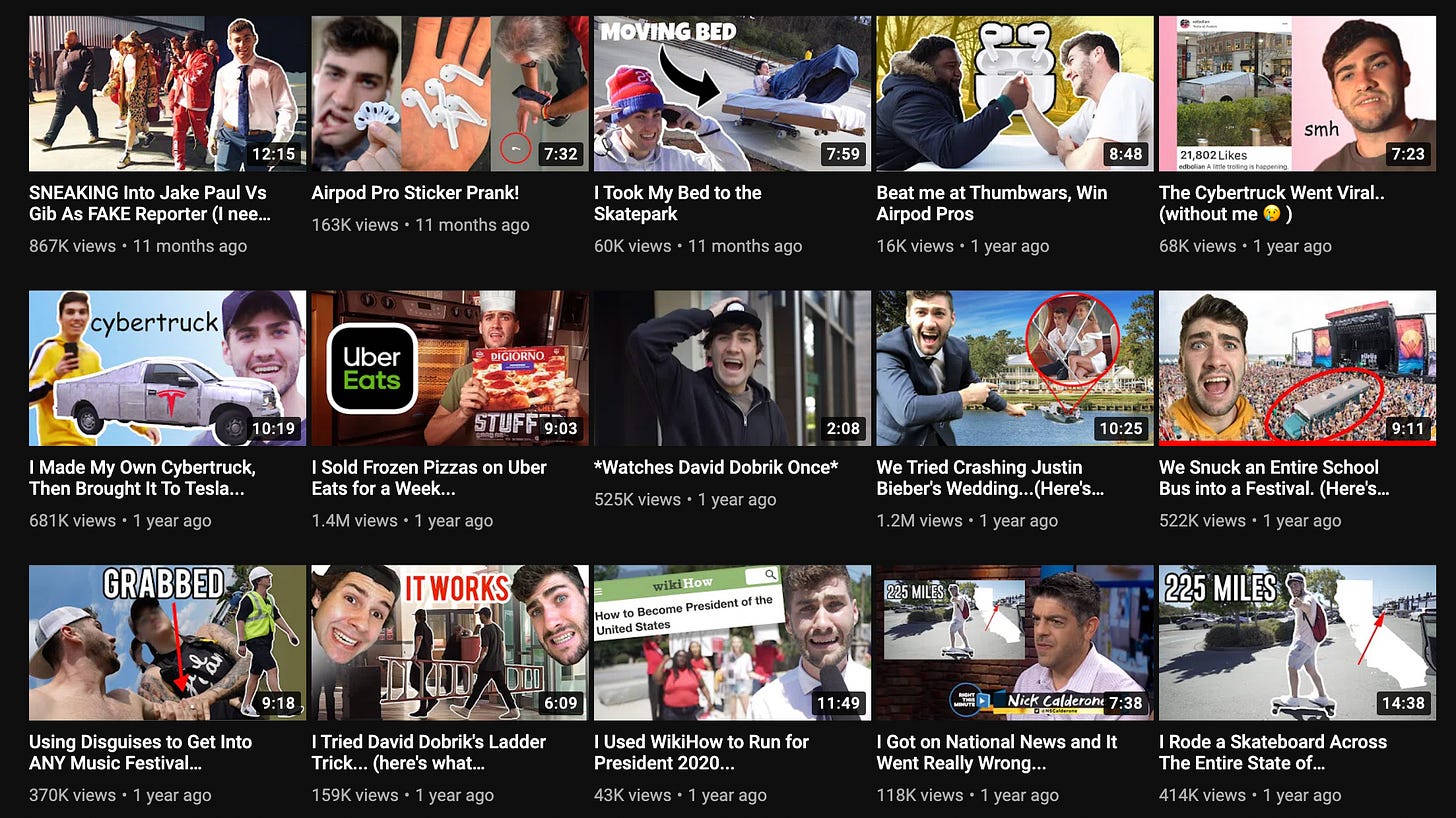 If you’re wondering how crazy his ideas were, just take a look at some of the video titles from about a year ago when he was just starting out on his mission in January 2020. None of these are clickbait titles and the videos are incredibly engaging.